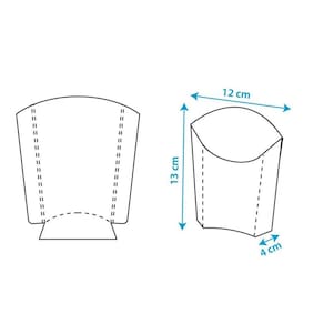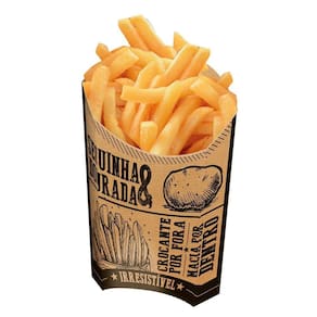 Caixa de montagem automática, prática e ideal para servir batatas fritas com elegância e higiene em lanchonetes, food trucks, festas e eventos. Impressa na cor preta e feita de papel kraft triplex 250g, sendo reciclável. Especificações: