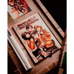 Com uma revolução política em andamento, a Divisão de Reconhecimento começa a ir atrás do apoio da população, rebelando-se contra o governo. Enquanto isso, Eren e Historiya se aproximam cada vez mais da verdade sobre a transformação dos titãs! Essa caixa especial contém o mangá Ataque dos Titãs 2 em 1 Vol. 8 (capa variante), 2 postais exclusivos e uma flâmula do brasão da divisão de reconhecimento!