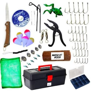 Caixa Estojo De Pesca Completa Cheia De Acessórios Maleta Caixa completa para pescar Além dos itens básicos da pescaria com uma quantidade maior como anzol 50 und. , boia 09 und , linha, ele vem com alicate pega peixe o que é essencial na pescaria na hora de retirar o peixe da agua que facilita bastante , vem também com suporte de chão para você colocar sua vara e deixar ela em espera até o peixe puxar a isca, inclui também um para cortar a linha na hora de amarrar o anzol entre outras coisas, sacola de nylon e também vem com uma massa pronta isca ela é muito conhecida nos pesqueiros, rios ,lagos e uma isca frog. Segue abaixo os itens e descrição do produto : itens: 01 - 01 un. Caixa maleta organizadora 02 - 01 un. Alicate pega peixe 03 - 50 un. Anzois divididos em 5 tamanhos 04 - 09 un. Boias cores em 3 tamanhos 05 - 12 un. Chumbadinhas divididos em 4 tamanhos 06 - 01 un. Linha 0,35 para 6 kg / 100 metros 07 - 01 un. 08 - 01 un. Isca frog perereca ideal para trairas/ tucunares ... 09 - 01 un. Massa pronta só iscar e pescar 10 - 01 un. Suporte de chão para vara 11 - 01 un. Sacola de nylon 12 - 01 un. Estojo com 8 repartições pequeno 13 - 02 un. Encastor 14 - 02 un. Girador 15 - 01 un. Stop para chumbada com 10 borrachinhas São mais de 70 unidades ... segue mais algumas descrições : Caixa Tamanho: 30 cm de comprimento x 15 cm largura x 13 altura Material: polipropileno Estojo Tamanho: 12cm comprimento x 8cm largura x 2,5cm altura Com 8 repartições com tampa transparente Cor: azul Material: polipropileno Linha 100 metros de linha 0,35mm de nylon monofilamento para 6 kg Anzol 10 unidades anzol marine sports n 04 - 2,4cm x 1cm 10 unidades anzol marine spors n 06 - 2,1cm x 0,8cm 10unidades anzol marine sports n 08 - 1,8cm x 0,7cm 10 unidades anzol marine sports n 12 - 1,4cm x 0,5cm 10 unidades anzol marine sports n 01 - 3,0cm x 1,3cm Material: aço niquel Boias 03 unidades boia n 1 - 1,5cm cores 03 unidades boia n 2 - 2,0cm cores 03 unidades boia n 3 - 2,5cm cores Material: isopor Cinza 07 unidades Cinza totalizando 2 gramas 02 unidades Cinza 5 gramas cada 02 unidades Cinza 10 gramas cada 01 unidade Cinza 15 gramas Material: Cinza Girador 02 unidades de girador n 08 medindo 2cm Material: aço inox Encastor 02 unidades medindo fio 0,26 x 10cm Material: fio de aço Stop chumbada 01 unidade de stop para segurar a chumbada na linha com 10 borrachinhas Tamanho: 15 cm aberto Material: metal Será enviado modelo conforme sem escolha Suporte para vara Tamanho: 20 cm comprimento x 7,5cm apoio da vara Material: metal pintado Sacola de nylon Tamanho : 30cm comprimento x 45cm altura Material: nylon