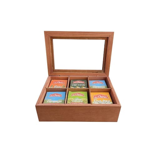 Características das caixas para chá: Produto fabricado em madeira maciça de qualidade; Não empena; Tampa de vidro 2 mm; Medidas aproximadas dos casulos larg x comp x alt : 7,5 x 7,5 x 7,0 cm. Chás não acompanham o estojo Imagens meramente ilustrativas