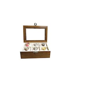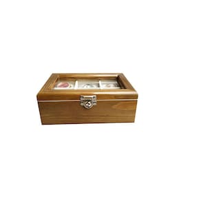 Prático e luxuoso, na linha madeira maciça encontrarmos um toque vintage, objeto decorativo onde são visíveis os veios naturais da madeira. Nossos estojos irão facilitar seu dia a dia com a organização e segurança que sua coleção precisa, além de proporcionar um ambiente mais sofisticado e elegante.Produzida com madeira natural de reflorestamento. Escolhida rigorosamente, totalmente tratada, tingida e envernizada externamente. Internamente, inclusive as divisórias são revestidas com nylon aveludado e as almofadas que acompanham o produto, normalmente são também em tecido aveludado. Na linha madeira maciça é possível observar os veios naturais da madeira. As dobradiças não são aparentes e possuem um limitador. A tampa possui visor com vidro transparente. Acompanha um fecho giratório de pressão em metal, ideal para colocar cadeado. Seus relógios sempre bem protegidos e acomodados confortavelmente, com toda segurança e facilidade no manuseio. Características das caixas para relógio: Produto fabricado em madeira maciça de qualidade, Padrão Cerejeira, Não empena, Revestimento interno aveludado, inclusive as divisórias, Fecho giratório de pressão em metal suporta cadeado , Tampa de vidro 2 mm, Acompanha almofadas para todos os casulos Medidas aproximadas dos casulos larg x comp x alt : 7,5 x 7,5 x 7,0 cm. Relógios não acompanham o estojo Imagens meramente ilustrativas Marca: Hobby artesamato