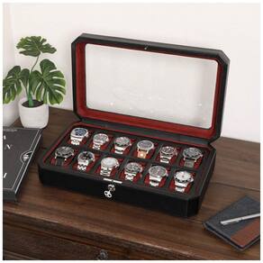 12 COMPARTIMENTOS GRANDES PARA RELÓGIOS Cada almofada mantém um relógio pequeno ou grande perfeitamente no lugar, até um ao lado do outro. Há muito espaço entre a tampa e as almofadas para acomodar relógios de todos os tamanhos. PRESENTE PERFEITO Seja um presente de dia dos pais para o pai, presente de aniversário para seu marido, presente de aniversário para seu filho ou presente de natal para a esposa, você certamente encantará até o destinatário mais difícil de agradar. Nosso design unissex é perfeito para qualquer colecionador de relógios em sua vida Ou dê a si mesmo Seus relógios merecem QUALIDADE INCOMPARÁVEL E DESIGN SOFISTICADO Nossa caixa possui um design exclusivo de meados do século que é a combinação perfeita de classe e funcionalidade. Cada caixa usa uma moldura de madeira envolta em couro PU preto de alta qualidade. O interior é coberto com um elegante tecido de micro camurça vermelho carmesim Marca: Não Informado