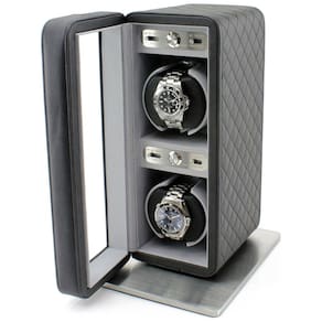 PROJETO DE QUALIDADE. O Heiden Monaco Double Watch Winder foi projetado com materiais de qualidade, como couro costurado em cruz, interior de linho cinza macio, travesseiro de relógio macio e muito espaço interior para guardar relógios grandes e grandes. A almofada do relógio pode ser usada nos lados planos ou redondos para segurar pulseiras pequenas e grandes. O enrolador de relógio usa o mais design japonês Mabuchi Motor and Gear. Ao ligar o relógio, você nem saberá que está ligado por causa do silêncio do motor. O movimentador de relógio foi projetado com magnetização zero para não prejudicar seus relógios. O movimentador de relógio é projetado nos EUA. O enrolador de relógio pode ser alimentado por 2 pilhas tamanho D ou pelo adaptador CA incluído 110 240V. Quando alimentado por baterias, durará de 1 a 3 meses, dependendo da configuração Marca: Não Informado