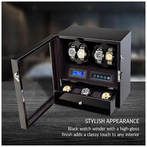 COMPATIBILIDADE UNIVERSAL 2 rotores programados individualmente e 15 programas de corda disponíveis oferecem compatibilidade para todos os modelos de relógio. Você pode definir o número de Turns Per Day de 650 a 1950 TPD. LUZ INTERIOR O movimentador do relógio possui luzes LED integradas. Os relógios ficam especialmente bonitos no escuro. OPÇÃO MOTOR STOP Ao abrir a porta, os rotores são desligados automaticamente. Isso permite que você evite a quebra do mecanismo de corda ao consertar o relógio. O relógio de pulso pode ser instalado ou removido apenas quando os rotores estão parados. TODA A SUA COLEÇÃO DENTRO 4 slots para enrolador de relógios e 5 compartimentos de zenamento de relógios proporcionam máxima usabilidade em um tamanho compacto. O DOOR LOCK permite impedir o acesso indesejado Marca: Não Informado