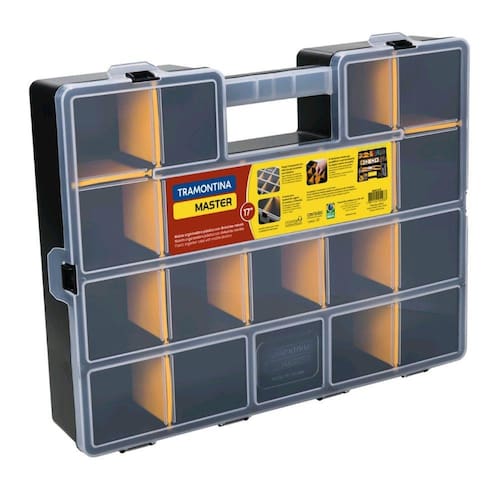 Medidas: comprimento 43cm x Largura 33cm x Altura 9cm. Leia atentamente a descrição do produto e caso ainda tenha duvidas, não deixe de perguntar que iremos responder o mais breve possível. Manter as ferramentas organizadas e facilitar o transporte das peças de um lado para o outro é a finalidade dos organizadores plásticos da Tramontina Master. Indispensável para quem gosta de deixar as ferramentas sempre em ordem, os organizadores também são ideais para guardar artigos de pesca, entre outros acessórios. Porque não basta ter a ferramenta certa, é preciso ter ela sempre à mão. Corpo e divisórias móveis injetadas em polímero de alta resistência. 19 compartimentos internos. 14 divisórias móveis que possibilitam a personalização do espaço interno da maleta. Tampa transparente com reforços que aumentam sua resistência. 4 Travas para fechamento seguro (2 frontais e 2 laterais). Projetada para fácil personalização e portabilidade. Possibilita encaixar martelo de tamanho pequeno e médio.