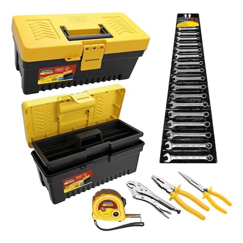 Caixa de Ferramentas Plastica + Jogo de Chaves Combinadas 6 a 22mm, Trena e Alicates