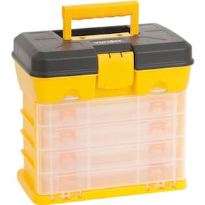 Indicado para organizar e armazenar peças e acessórios em geral. Possui alça para transporte, 4 bandejas móveis e 1 compartimento na tampa. Detalhes Técnicos: Comprimento do organizador para ferramentas: 275,0 mm Largura do organizador para ferramentas: 175,0 mm Altura do organizador para ferramentas: 260,0 mm Material do organizador para ferramentas: Polipropileno Cor do organizador para ferramentas: Preto/amarelo e transparentes Capacidade de carga: 10 kg E CDC : legal: 90 dias Marca: Não Informado