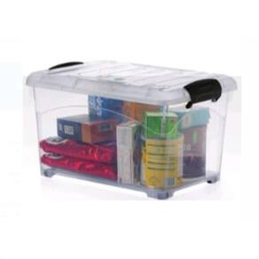 Material: polipropileno Cor: transparente Capacidade: 25l Travas pretas Medidas com tampa: 43 x 26 x 32 cm cxaxl Peso aprox: 600g Marca: injeplastec Cód fornecedor: 1800