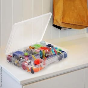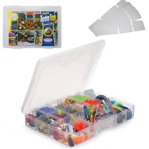 BENEFÍCIOS:As caixas organizadoras foram pensadas para você guardar as mais diversas miudezas, deixando seu quarto, escritório, loja muito mais organizado passando credibilidade e bem estar.Ideal para guardar bijouterias, materiais de pesca, ferramentas, cosméticos, linhas de costura, material escolar, pintura, parafusos e muitos outros. veja as fotos Monte as divisões da sua caixa organizadora da forma que desejar A caixa possui divisórias verticais móveis, com até 18 espaços ideais para organizar objetos de tamanhos variados.Conta com alça integrada no corpo da caixa, auxiliando no transporte. Confira a foto no anúncio.DESCRIÇÃO:1 Caixa com 18 divisórias móveisDimensões: A 6cm X L 27cm X C 36cmCor: transparenteComposição: Polipropileno PP - Material atóxico livre de BPAQuantidade de divisórias: 18 divisórias móveisTampa com travaAlça integrada no corpo da caixaObs: Os itens constantes nas fotos desse anúncio não acompanham o produto.