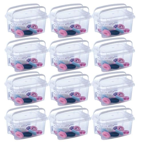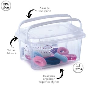 Conjunto com 12 unidades. Caixa plástica transparente com capacidade para 1,52 litros. Possui travas laterais e alças, proporcionando mais segurança durante o transporte. É produzida em material atóxico e livre de BPA. Ideal para organizar sua casa ou escritório. Material: polipropileno Capacidade: 1,52 litros Comprimento: 18,4 cm / Largura: 13,4 cm / Altura: 10,3 cm