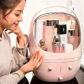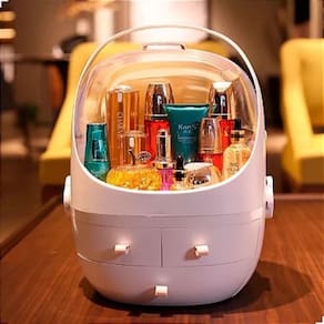 Proteção Completa: O design à prova d'água e à prova de poeira garante que seus cosméticos e acessórios estejam sempre protegidos. A tampa transparente e curvada oferece uma visão clara dos itens armazenados, enquanto os mantém livres de poeira e umidade.