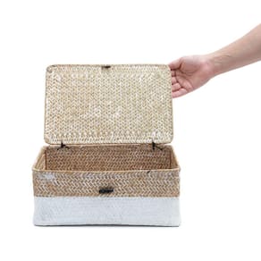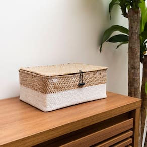 Essa é a caixa organizadora de seagrass 30cm branco com fecho da OIKOS. Prática: boa para organizar toalhas, roupas, brinquedos, livros, jogos, pastas, produtos de limpeza e muito mais. Versátil: vai bem em qualquer ambiente da casa: no quarto do casal ou do bebê, no banheiro, na lavanderia, na sala ou na cozinha. você que manda! Empilhável: além de ser charmosa, seu corpo permite empilhar uma caixa em cima da outra, otimizando os espaços e deixando tudo bem organizado. Decorativa: esse item é charmoso e neutro, ele harmoniza com diversos estilos de decoração, deixando sua casa mais aconchegante e cheia de bossa. Funcional: essa caixa permite deixar tudo em ordem na casa, sem falar que otimiza os espaços e ainda deixa cada cantinho mais convidativo. Detalhes: seu fecho é de metal, deixando o interior protegido e dando uma aparência mais moderna à peça. o trançado de seagrass tingido de branco chama tanta atenção nesse item, que ele pode ser utilizado somente como peça decorativa :). Feita de seagrass: seu material é uma tendência no mundo da decoração, atributos não faltam: ele é ecológico, 100% natural, trançado, leve, firme e biodegradável. legal, né? Durável e higiênica: só precisa lavar e secar de acordo com as recomendações, combinado? Feita em três medidas: essa caixinha tem 30cm de comprimento, 20cm de altura e 12cm de largura. ainda contamos com outros tamanhos no nosso sortimento: 27cm e 24cm de comprimento. ah, vários tamanhos combinados podem deixar a casa ainda mais bonita, fica a dica :)