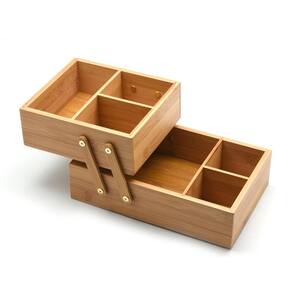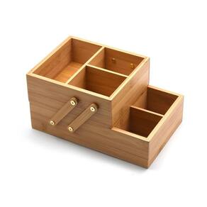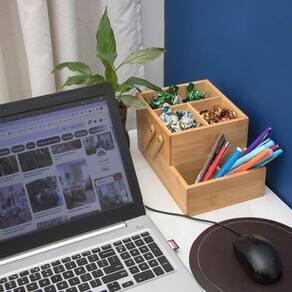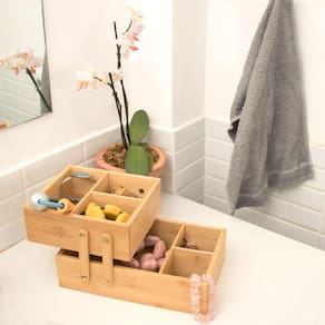 A Caixa Organizadora em Bambu 2 Andares da OIKOS é super prática e serve para guardar o que quiser, como itens de escritório e banheiro, bijus e até doces. Articulada, pode ser utilizada totalmente fechada ou meio aberta. Você escolhe!