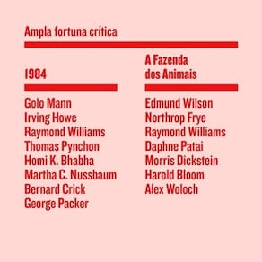 As duas obras-primas de um dos autores fundamentais do nosso tempo, em edições especiais com ensaios visuais exclusivos, retrospectiva de capas históricas e ampla fortuna crítica escrita por grandes nomes da teoria literária. 1984 e A Fazenda dos animais, dois dos romances mais emblemáticos do século XX, reunidos em um box especial. Para colecionadores. Em um projeto gráfico especialíssimo, com capa em tecido, corte impresso e ensaio visual das artistas brasileiras Regina Silveira e Vânia Mignone, as novas edições de 1984 e A Fazenda dos animais trazem apresentação do crítico Marcelo Pen e ensaios que dão conta da história da recepção crítica dos romances desde o seu lançamento. São textos inéditos no Brasil de autores como Golo Mann, Irving Howe, Raymond Williams, Thomas Pynchon, Homi K. Bhabha, Martha C. Nussbaum, Bernard Crick, Edmund Wilson, Harold Bloom, Daphne Patai, George Packer, entre outros, verdadeiros guias de leitura para mergulharmos no universo de Orwell. A Fazenda dos Animais conta também com nova tradução, feita por Paulo Henriques Britto, e um texto exclusivo relembrando a história das edições brasileiras do romance e abordando ligações entre política e literatura — e o que levou o livro a ter sido conhecido como A revolução dos bichos no país.