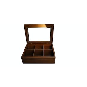Prático e luxuoso, na linha madeira maciça encontrarmos um toque vintage, objeto decorativo onde são visíveis os veios naturais da madeira. Nossos estojos/caixas irão facilitar seu dia a dia com a organização para os saches de Chá, além de proporcionar um ambiente mais sofisticado e elegante.Produzida com madeira natural de reflorestamento. Escolhida rigorosamente, totalmente tratada, tingida e envernizada externamente. Internamente. Na linha madeira maciça é possível observar os veios naturais da madeira. A tampa possui visor com vidro transparente. O acabamento interno com as divisórias é feito na própria madeira.Características das caixas para chá:- Produto fabricado em madeira maciça de qualidade,- Não empena,- Tampa de vidro 2 mm,- Medidas aproximadas dos casulos (larg x comp x alt): 7,5 x 7,5 x 7,0 cm. Chás não acompanham o estojo - Imagens meramente ilustrativas