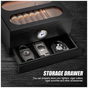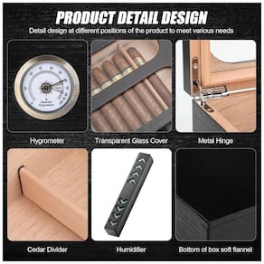 Com um trabalho requintado, nosso umidadeador grande foi refinado a partir de toras de cedro espanhol, com interior feito de cedro também proveniente da Espanha. A superfície adotou a técnica de laca, simples e sofisticada, resistente ao desgaste. O design de vedação especial resolve efetivamente problemas de vedação comuns em caixas de charutos tradicionais, evitando vazamento de umidade. Com capacidade para até 20-35 charutos, este umidor oferece espaço amplo para armazenar e categorizar seus charutos, trazendo grande conveniência. A janela de exibição no topo, feita de vidro forte e madeira maciça, permite visualizar os charutos claramente, sem precisar abrir a tampa, tornando o umidor mais elegante e demonstrando seu bom gosto artístico. Com higrômetro avançado e sistema de umidificação, garante a manutenção da umidade e aroma autênticos dos charutos. A umidade ideal para armazenamento a longo prazo de charutos é recomendada entre 65 e 76. Equipado com gaveta para armazenar isqueiros, cortadores de charuto e outros acessórios, garantindo praticidade. Inclui higrômetro frontal, umidificador, divisor de cedro removível, conta-gotas e manual do usuário.