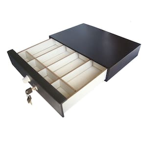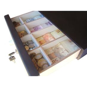 Caixa De Dinheiro Niqueleira Gaveta Noteiro Preta Com Chave- Com puxador manual frontal.- Com fechadura e chave reserva.- Produto novo.- Material: Madeira.- Cor: Preto fosco.- Acabamento: Pintura de alta resistência e lavável.- Dimensões: 36,5 cm comprimento x 26,5 cm Profundidade x 8 cm de altura.- Garantia: 3 meses.ITENS INCLUSOS:- Gaveta de Dinheiro. Cor: Preto Fosco. Modelo: Compact Com Chave- Chave Reserva.- Puxador Branco.- Certificado de Garantia. Marca: Móveis Diniz