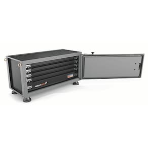 Estrutura em chapas de aço conformadas de 1,2 mm. 5 gavetas com corrediças telescópicas. Fechadura reforçada com chave. Porta com borracha de vedação contra poeira. Pintura eletrostática.Capacidade de carga máxima gavetas com altura de 50 mm: 30 kg. Capacidade de carga máxima gavetas com altura de 105 mm: 40 kg. 4 pés com sistema de amortecimento anti vibração (Vibra stop). Utilizado para o armazenamento de ferramentas e base de trabalho para manutenção de peças. Capacidade de carga e resistência da estrutura comprovadas através de testes práticos.