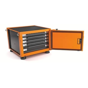 Estrutura em chapas de aço conformadas de 1,2 mm.5 gavetas com corrediças telescópicas. Fechadura reforçada com chave. Porta com borracha de vedação contra poeira. Pintura eletrostática.Capacidade de carga máxima gavetas com altura de 50 mm: 30 kg. Capacidade de carga máxima gavetas com altura de 105 mm: 40 kg. 4 pés com sistema de amortecimento antivibração (Vibra stop).Utilizado para o armazenamento de ferramentas e base de trabalho para manutenção de peças. Capacidade de carga e resistência da estrutura comprovadas através de testes práticos.