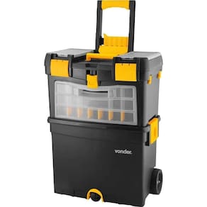 Destaques: A caixa superior possui duas travas plásticas frontais reforçadas, ganchos nas laterais para enrolar extensões elétricas de cabo fino, dois compartimentos externos na tampa, bandeja frontal destacável com múltiplas divisórias, bandeja interna removível e permite o travamento com cadeado. A caixa inferior possui duas travas laterais (permite o travamento com cadeados), ganchos traseiros para enrolar extensões elétricas de cabo médio e bandeja interna removível. Conta ainda com uma terceira roda para facilitar a movimentação da caixa, dando mais praticidade ao usuário.