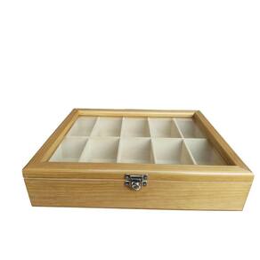 Caixa para Óculos C/10 Divisórias Cerejeira floco bege: Caixa para Óculos C/10 Divisórias Prático e luxuoso, na linha madeira maciça encontrarmos um toque vintage, objeto decorativo onde são visíveis os veios naturais da madeira. Nossos estojos irão facilitar seu dia a dia com a organização e segurança que sua coleção precisa, além de proporcionar um ambiente mais sofisticado e elegante. Produzida com madeira natural de reflorestamento. Escolhida rigorosamente, tratada com fungicidas e anticupins. Envernizada externamente com verniz poliuretano industrial. Internamente as laterais e divisórias são revestidas com nylon aveludado. E as almofadas que acompanham o produto, normalmente são também em tecido aveludado. Na linha madeira maciça é possível observar os veios naturais da madeira. As dobradiças não são aparentes e possuem um limitador. A tampa possui visor com vidro transparente. Acompanha um fecho giratório de pressão em metal, ideal para colocar cadeado. Seus relógios sempre bem protegidos e acomodados confortavelmente, com toda segurança e facilidade no manuseio. características das caixas para óculos: Produto fabricado em madeira maciça de qualidade Padrão cor Cerejeira; Não empena, não trinca, não racha; Revestimento interno aveludado, inclusive as divisórias; Fecho giratório de pressão em metal suporta cadeado ; Tampa de vidro 2 milímetros; medidas aproximadas dos casulos larg x comp x alt : 7,5 x 7,5 x 7,5 cm; Relógios não acompanham o estojo Imagens meramente ilustrativas