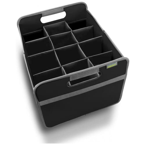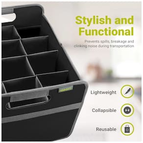 SUPORTA ATÉ 29 kg. Caixa resistente dobrável para transportar vinho ou outras garrafas cabe em champanhe. Alças reforçadas acolchoadas e dois bolsos de malha para guardar acessórios de vinho. Dobra se em três etapas fáceis. A inserção é removível e dobra plana