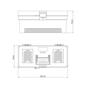 Corpo injetado em plástico de alta resistência. Trava plástica. Pino em aço para reforçar a articulação da tampa. Bandeja plástica interna removível. Capacidade de carga interna: 10 Kg.
