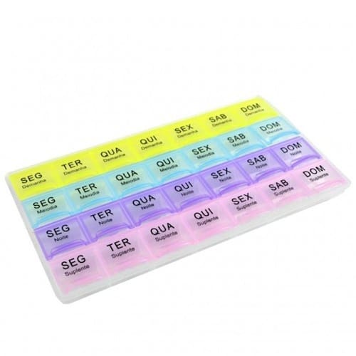 Porta Comprimidos com 4 compartimentos por dia, 7 dias da semana. Indispensável para quem toma vários comprimidos e para quem cuida de pessoas que necessitam tomar vários remédios ao dia. Organize seus remédios de forma prática e compacta. Este porta comprimidos é semanal e você pode ver qual o dia da semana que já tomou os remédios. Muito útil e organizado, ótimo para quem faz uso contínuo de remédios.