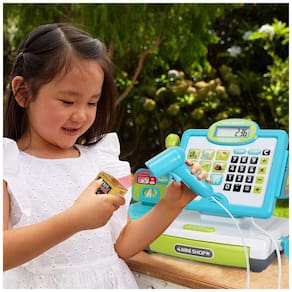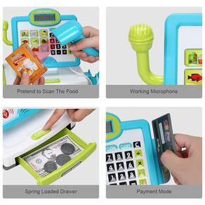 Caixa Registradora Educativa com Calculadora e Microfone Função calculadora: Ensina matemática, contagem e uso do dinheiro de forma lúdica. Roleplay criativo: Simula compras com cesta, botões de "alimentos" e dinheiro de mentira para aplicação prática de matemática. Presente ideal: Desenvolve coordenação motora e habilidades sociais (crianças 3+ anos, indicado para 6-8 anos). Multifuncional: Inclui gaveta grande, alimentos de brinquedo e microfone para prática de fala/canto. Ferramenta pedagógica: Auxilia no ensino de matemática básica e simulações do cotidiano.