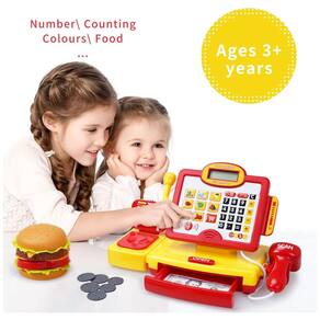 Caixa Registradora Multifuncional com Leitor de Código de Barras, Calculadora, Microfone, Gaveta Pop-Up, Cesta e Acessórios de Comida DIY Simula processo de compras, ensina sobre dinheiro e desenvolve habilidades sociais (4-5 anos). Inclui alimentos simulados, notas, moedas e efeitos sonoros para aprendizado lúdico (3-5 anos). Brinquedo educativo ideal para matemática básica e roleplay (5-7 anos). Presente para datas festivas (Natal, Páscoa, aniversários).