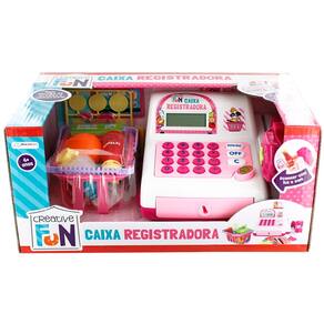 Tenha seu próprio negócio e divirta-se brincando com seus amigos e familiares. Com a Caixa Registradora da Creative Fun, você se torna dono de um estabelecimento. Ela vem com cartão de crédito, dinheirinho (notas e moedas) e vários itens de mercado para você montar o seu próprio negócio em qualquer lugar da sua casa e brincar de patrão. Acompanha ainda uma linda cesta de compras. A calculadora funciona de verdade e o dinheiro fica guardado na gavetinha com chave que faz som de caixa registradora. Passe o cartão e veja o recibo, que faz um som quando abre.