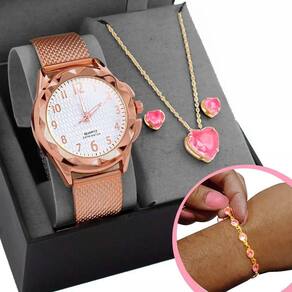 Caixa + Relogio Feminino Prova Dagua Banhado + Colar + Pulseira Presente Moda Zirconia Social Rose Kit Elegante de Acessórios! Adicione um toque de estilo delicado e sofisticado ao seu look com este encantador conjunto de acessórios. Este kit é perfeito para agradar a si mesmo ou surpreender alguém especial.