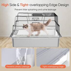 - ?Design lateral alto de 43,3 cm e borda apertada sobreposta?Lado de 43 cm de altura acima de outros produtos, a caixa de areia para gatos GG é muito adequada para gatos que fazem xixi em pé ou gostam de cavar buracos, evitar respingos de areia e vazamento de urina. Borda sobreposta apertada da caixa de areia de aço inoxidável fechada, evita vazamento urinário em vez de vazar pelas costuras e sem vazamento de odor.