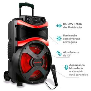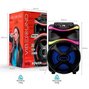 A V12 Power é uma caixa de som amplificada de 800W RMS que oferece potência e qualidade sonora, com graves profundos e agudos cristalinos. Possui Bluetooth para conexão sem fio, função TWS para conectar duas unidades e múltiplas opções de conectividade. Com bateria recarregável, iluminação dinâmica, rádio FM, microfone incluso para soltar a voz no karaokê e fácil transporte, a V12 Power é ideal para levar sua Vibe onde você for.