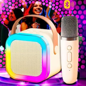 Caixa de Som Karaokê Portátil Bluetooth Microfone Sem Fio Com Luz LED Adulto Desfrute de som de alta qualidade em qualquer lugar, sem fios, graças à conectividade Bluetooth e surpreenda seus amigos com a função exclusiva de mudança de voz, adicionando ainda mais diversão às suas festas