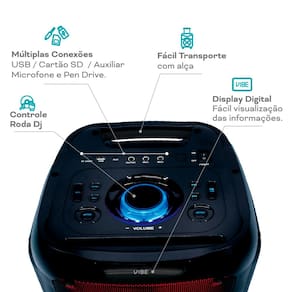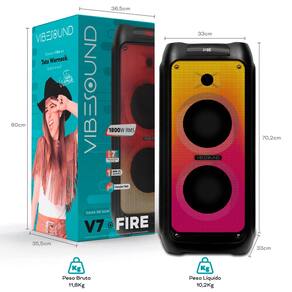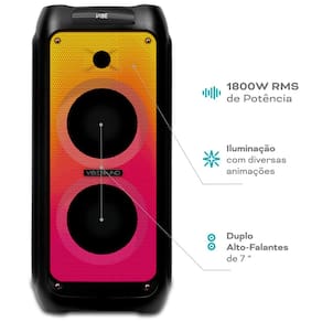 Sinta a Vibe da música como nunca antes! A V7 FIRE tem potência de 1800W RMS com som de alta qualidade. Conectividade Bluetooth para curtir suas playlists e função TWS para conectar duas caixas e ter um som imersivo. Várias entradas: USB, cartão SD, auxiliar, microfone e display digital para controle fácil. Rádio FM integrado, controlador estilo DJ e iluminação RGB para animar a festa, além de alça prática para fácil transporte.
