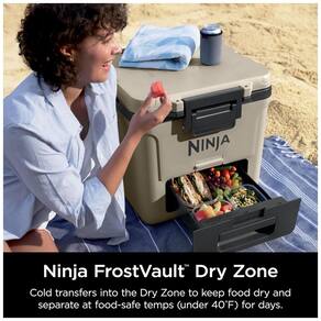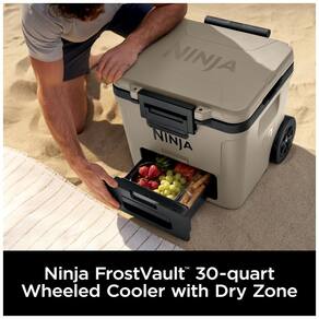 A caixa térmica com rodas Ninja FrostVault 30QT foi desenvolvida para conservação de bebidas e alimentos em ambientes externos, com isolamento de alto desempenho e gaveta inferior em zona seca refrigerada. A tecnologia FrostVault transfere o frio do compartimento principal para a gaveta Dry Zone, mantendo os alimentos frios, secos e separados do gelo, em faixa de temperatura segura abaixo de 4,5°C por vários dias quando utilizada com gelo adequado.