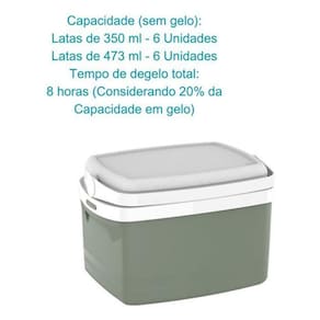 Tempo de degelo total: 8 horas Considerando 20% da Capacidade em gelo Dicas e instruções de uso: - Nunca lave o produto por imersão, cuide para não danificar o isolamento térmico; - Não aplicar carga peso acima do especificado; - Produto atóxico; - Transportar sempre com a tampa fechada; - Não utilizar objetos abrasivos como esponja de aço, fibras abrasivas ou similares para sua limpeza; - Limpeza interna: se houver cheiro em seu interior, lave-o com água e sabão neutro; - Posteriormente, deve-se encher o produto com uma solução de água com uma colher de sopa de Bicarbonato de Sódio; - Limpeza externa: deve ser executada com sabão, ou detergente e esponja e água; - Não colocar objetos pontiagudos sem a devida proteção; - Os alimentos devem ser sempre embalados, evitando o contato direto com o interior da caixa; - A vida útil do produto está diretamente relacionada aos cuidados tomados durante seu uso, armazenagem e transporte.