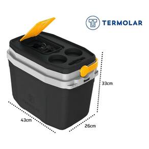 Ficha Técnica: - Marca: Termolar - Cor: Preto e Amarelo - Capacidade: 20L - Conservação Térmica: 12h sem gelo / 24h com gelo - Material Externo: Plástico - Isolamento Térmico: Poliestireno Expandido EPS - Livre de BPA: Sim - Material Atóxico: Sim