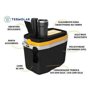 Ficha Técnica: - Marca: Termolar - Cor: Preto e Amarelo - Capacidade: 20L - Conservação Térmica: 12h sem gelo / 24h com gelo - Material Externo: Plástico - Isolamento Térmico: Poliestireno Expandido EPS - Livre de BPA: Sim - Material Atóxico: Sim