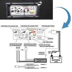- Acionamento automático por áudio na entrada de baixa impedância.
