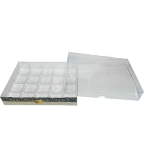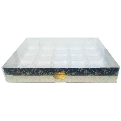 Caixa para Bombom Flores com 20 CavidadesA Caixa para Bombom com estampa de rosas em diferentes tons de verde, possuindo 20 cavidades para a colocação dos bombons, tendo cada cavidade cerca de 3 cm de largura e comprimento. No total, a caixa para bombom apresenta 19,5 cm de comprimento e 15,5 cm de largura, além de 3 cm de altura. Pode ser utilizado para presentear seus entes queridos com uma caixa com design agradável e tamanho suficiente para 20 bombons de até 3 cm de diâmetro.