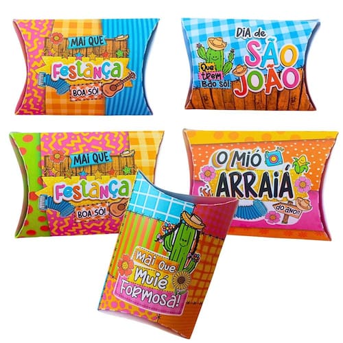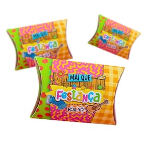 Caixinhas 50 Unidades Festa Junina - Surpreenda com Criatividade Dê um toque especial à sua Festa Junina com nossas 50 Caixinhas temáticas. Com 5 estampas diferentes e vibrantes, elas são perfeitas para embalar docinhos, lembrancinhas ou pequenos mimos. Feitas em papel offset 180g, possuem um design criativo em formato de travesseiro que encanta a todos. O kit inclui: 50 Caixinhas desmontadas, sendo 10 unidades de cada estampa Dimensões: Aberta: 14cm x 18cm Área útil: 8cm x 8,5cm