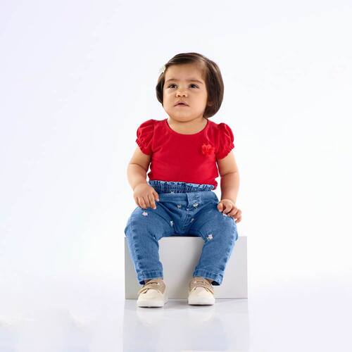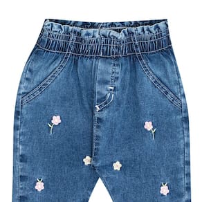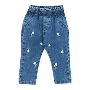 Sua pequena fashionista no estilo e conforto que ela merece com nossa calça jeans na cor indigo médio com elastano na cintura para maior conforto e segurança para usar no dia a dia. Para deixar a peça ainda mais fofa e moderna que tal bordados de flores na parte frontal da calça? Uma fofura né!