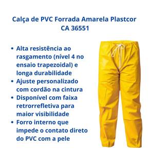Calça de PVC Forrada Amarela Plastcor CA 36551 Proteção e conforto em ambientes úmidos Calça de segurança confeccionada em tecido 100% poliéster revestido com PVC, com cordão regulável na cintura e design ergonômico para máximo conforto. Ideal para atividades que exigem proteção contra umidade e respingos de água.