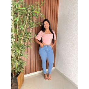 A calça da imagem é um modelo jeans feminino skinny de cintura alta. A peça tem uma lavagem clara clássica, sem detalhes como rasgos ou desfiados. Possui passadores para cinto e bolsos frontais e traseiros, com um corte ajustado que se molda ao corpo da cintura até a barra. Marca: Não Informado