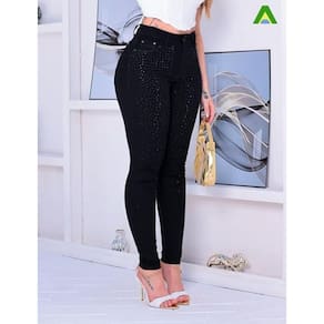 Calça Feminina de Sarja Preta Com Brilho Strass Modelagem com bastante elastano (power lycra), que se molda perfeitamente ao corpo, cintura alta na linha do umbigo e pala coração que modela o bumbum. A peça certa que, além de linda, modela as pernas e o quadril. Tecido de extrema qualidade, super resistente, flexível e confortável. Conta com detalhes brilhantes na parte da frente, que da um toque charmoso e elegante à calça. Brilhos de qualidade (importados) com excelente durabilidade, resistentes a lavagem à máquina. A peça perfeita para uma saída casual, comemorações e festas!