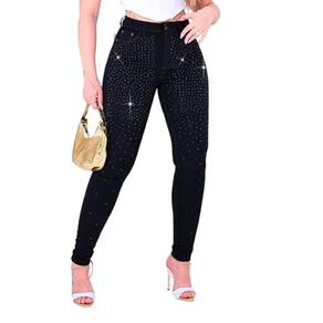 Calça Feminina de Sarja Preta Com Brilho Strass Modelagem com bastante elastano (power lycra), que se molda perfeitamente ao corpo, cintura alta na linha do umbigo e pala coração que modela o bumbum. A peça certa que, além de linda, modela as pernas e o quadril. Tecido de extrema qualidade, super resistente, flexível e confortável. Conta com detalhes brilhantes na parte da frente, que da um toque charmoso e elegante à calça. Brilhos de qualidade (importados) com excelente durabilidade, resistentes a lavagem à máquina. A peça perfeita para uma saída casual, comemorações e festas!