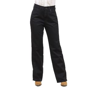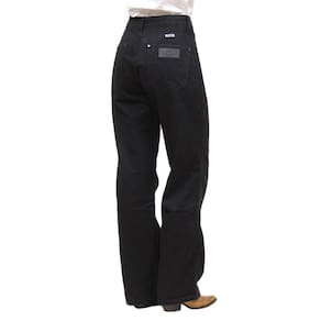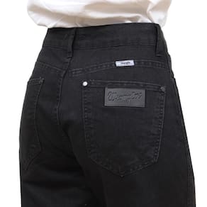Uma Calça Jeans Feminina na qualidade Wrangler modelo Wide Leg, ou seja, mais larga em toda a perna, esta fabricada em tecido jeans feito de Algodão e Poliéster de alta qualidade na cor Preto, possui 3 bolsos na frente e 2 atrás em modelo tradicional, rebites de metal e botão personalizado.