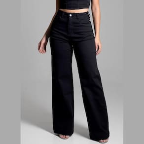 Calça feminina confeccionada em sarja. O modelo possui cintura super alta, gancho no lugar e caimento amplo da coxa até a barra. Cintura alta Fechamento através de um botão e zíper Bolsos frontais e posteriores funcionais. Barra simples Tecido: Sarja Tipo de Lavagem: Color Cor: Preto Composição:73% Algodão 24%Poliéster 3%Elastano Medidas Modelo Manequim 38
